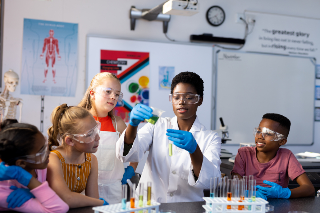 Diverse female teacher and schoolchildren doing an experiment in chemistry class. Education, inclusivity, elementary school and learning concept.